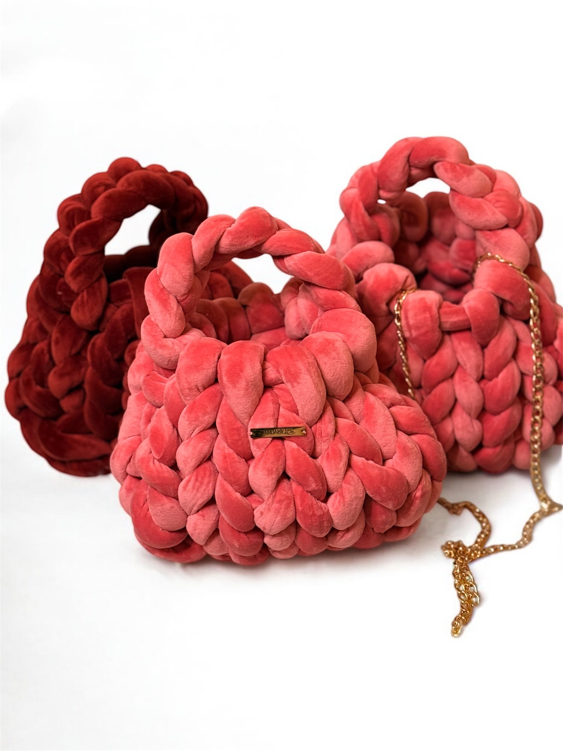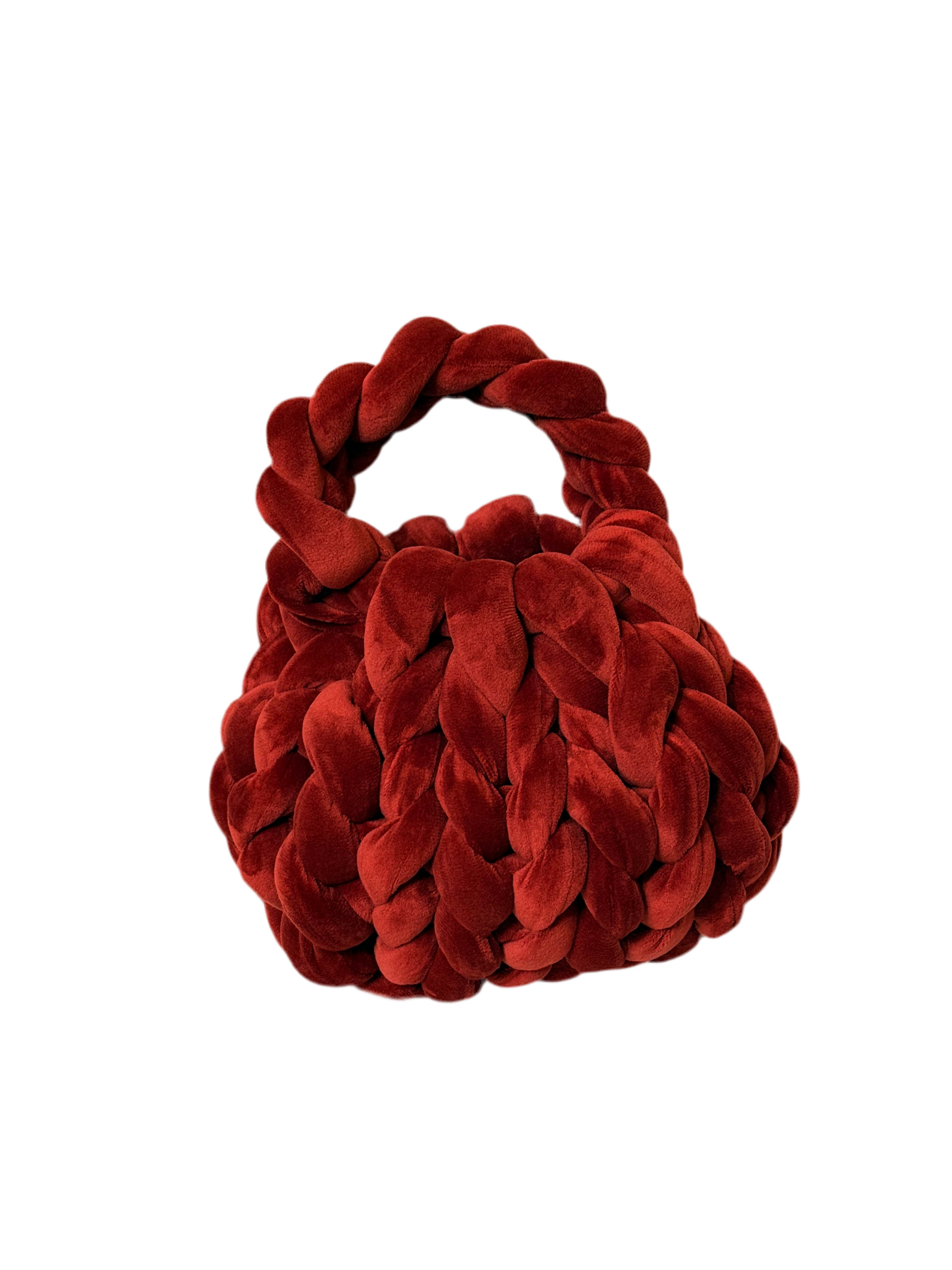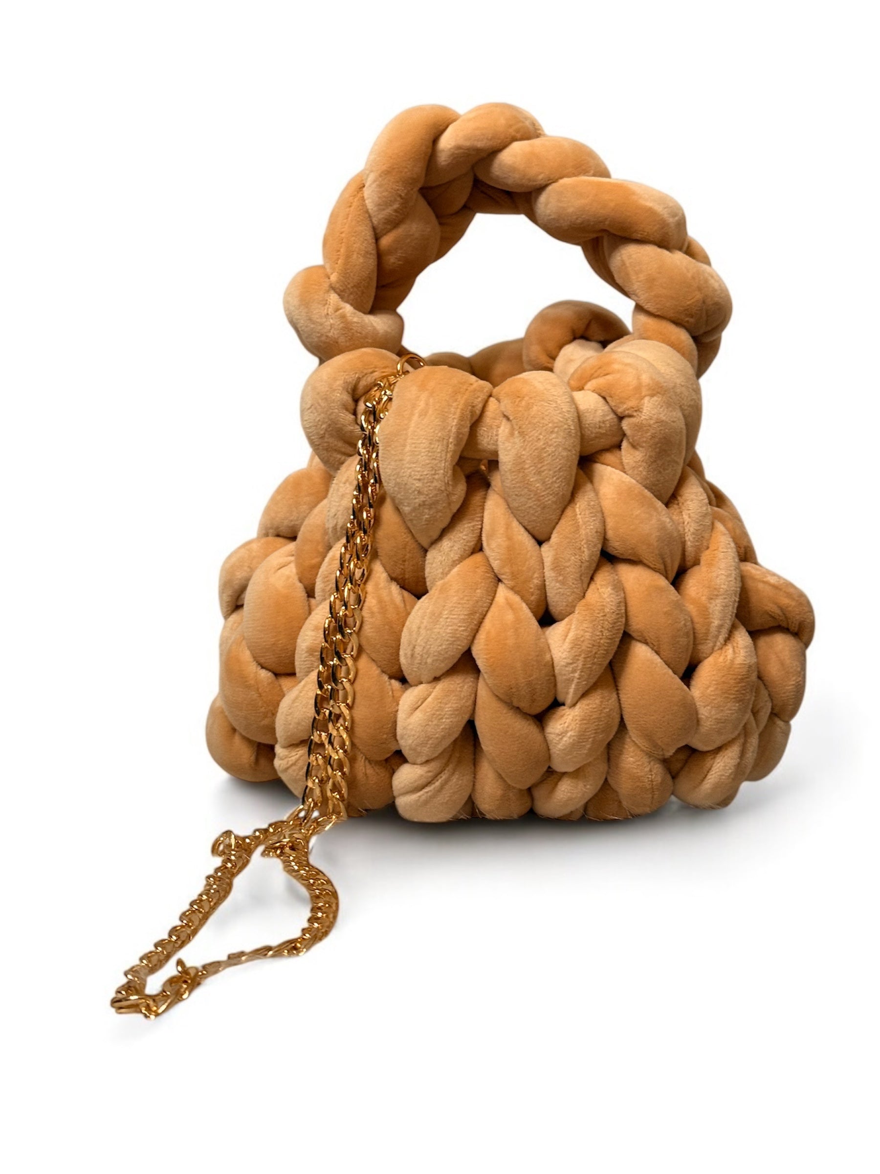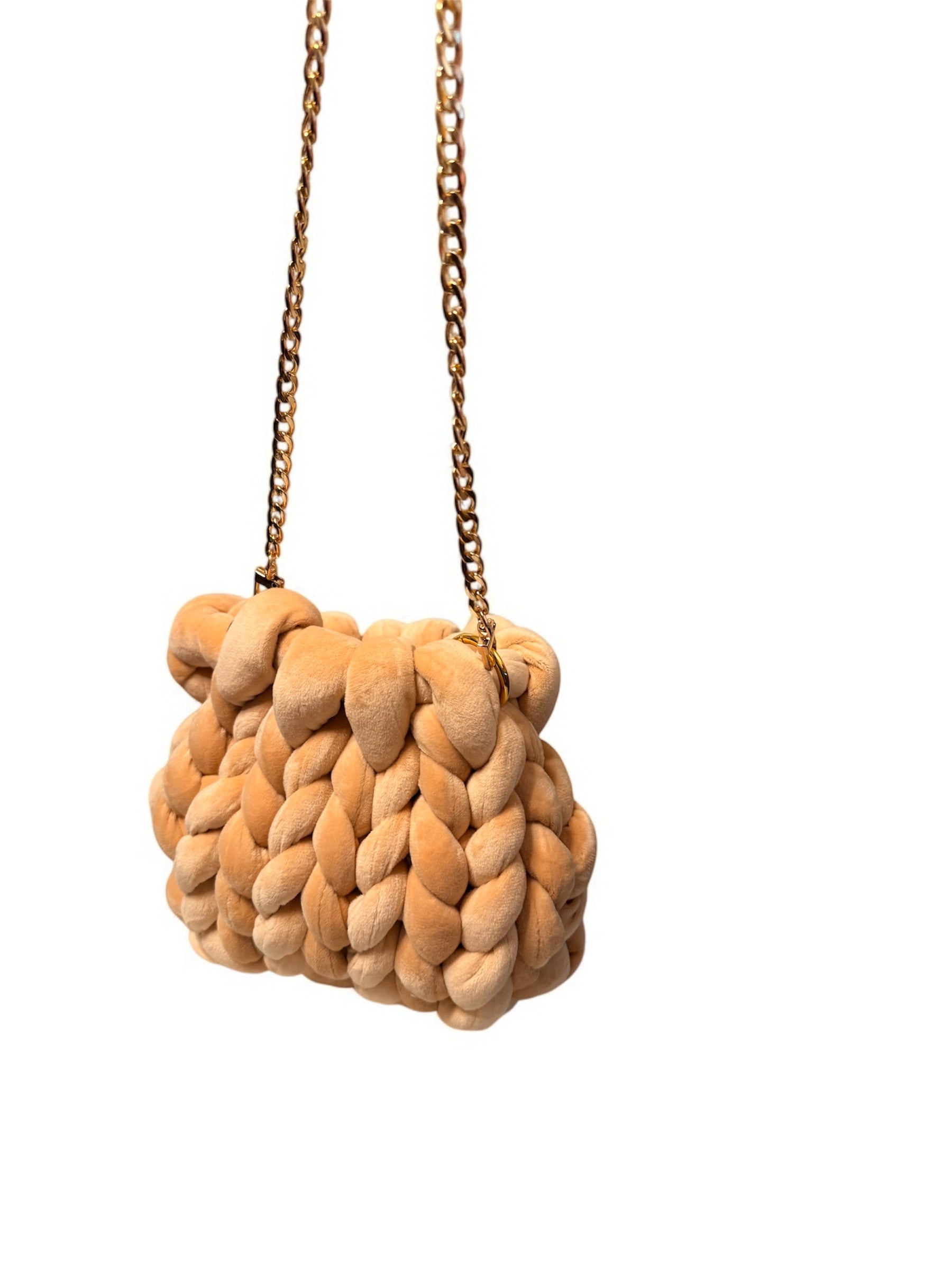 Turn heads with this ultra-soft, eye-catching braided velvet handbag. Made with luxurious plush fabric and styled with an optional gold chain chain strap, this bag blends cozy comfort with chic design. This versatile bag can be made with just a braided strap or a braided strap with detachable gold chain or with just a gold chain and can be worn as a mini handbag, a shoulder bag or cross-body. You decide! Whether you’re dressing up or keeping it casual, it’s the ultimate accessory for effortless style.